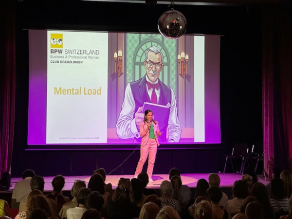 Dr. Evelyn Mauch und Dr. Barbara Studer erklärten auf verständliche und lebendige Weise, was Mental Load im Gehirn bedeutet und wie sich ständige Belastung auswirkt. Mit viel Know-how, Humor – und sogar einer Geigeneinlage von Barbara Studer – wurde klar: Wissen kann zugleich tiefgründig und unterhaltsam sein.